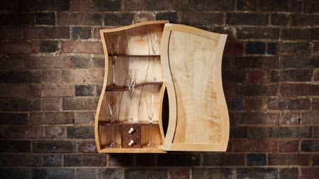 This wall-mounted cabinet is designed and made to house five champagne flutes in a unique and quirky manner.