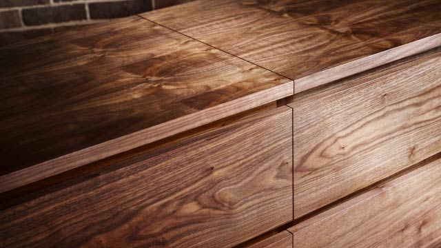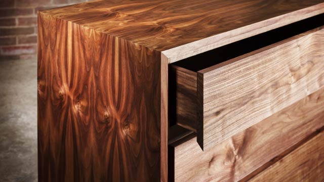 With this piece as well as the material choice and line detailing, the grain direction and flow running around the outside of the piece and through the solid Walnut drawer fronts complete the design.