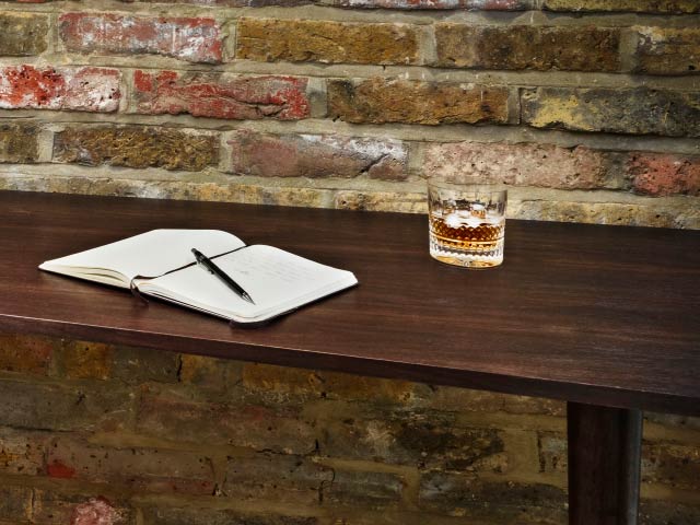Concealment and function are combined within the same piece to create a fitted desk with a concealed gun cabinet at one end. The cabinet door is fitted with a discreet push latch mechanism and polished brass butt hinges. Two solid Walnut turned legs support the front of the desk while discreet fixings support the back.