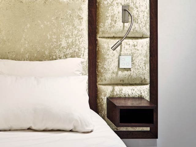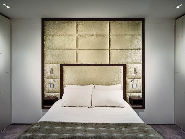 Reading lights and touch-sensitive switches were installed within the upholstered panels, along with Walnut bedside alcove shelves.